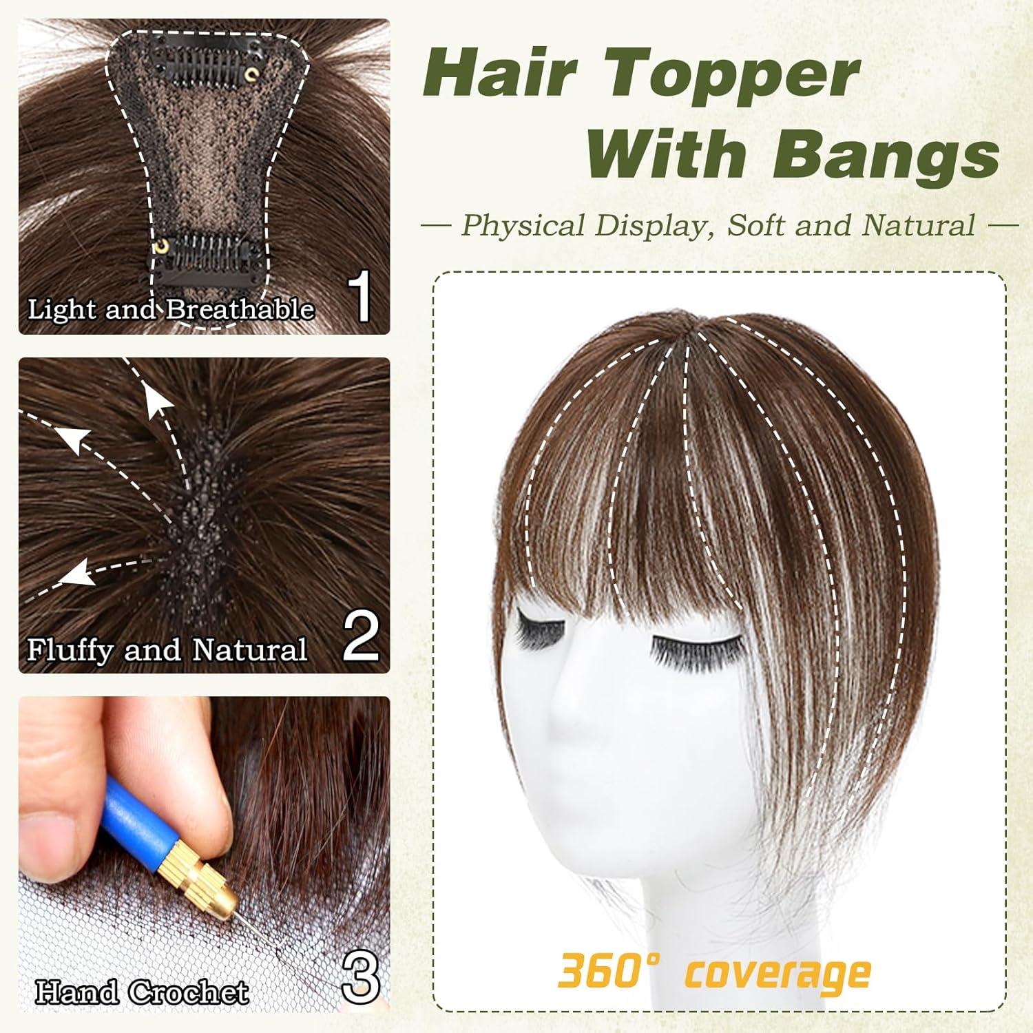 【Large Coverage Area】Compared with other bangs, our clip in bangs human hair can cover the top of your head 360°, blending in with your own hair. This hair toppers for women real human hair can solve hair problems such as wide hair gaps, high hairlines,and covere gray hair on the top of the head. Presents extremely realistic effects!