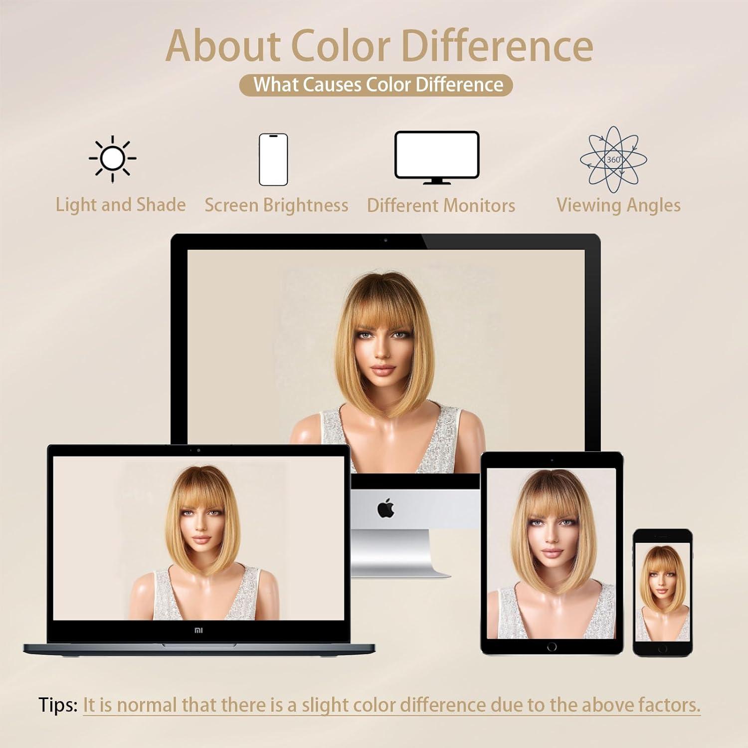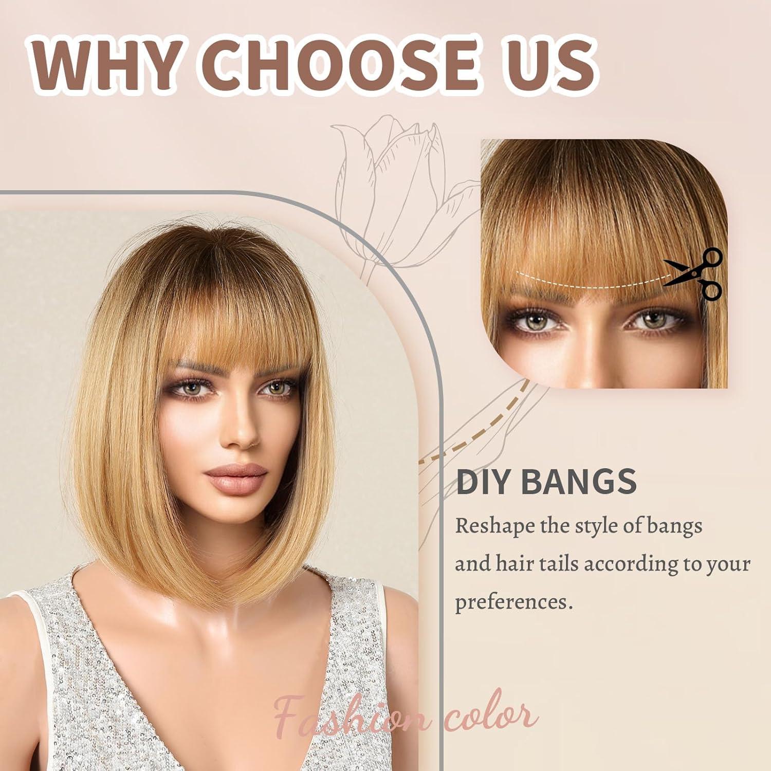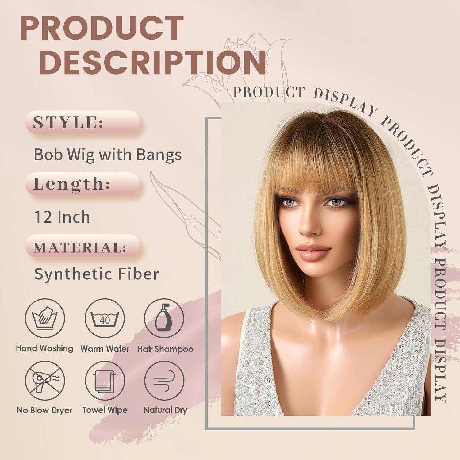 NAYOO Short bob wig adopted new 100% high-temperature heat resistant synthetic fiber hair. Its physical properties, appearance, color, and texture are highly similar to real hair, and look just like real hair. Our straight bob wig adopted breathable, safe, comfortable material. Package included (including free gift package): * Short bob wigs with bangs x 1 * Wig cap x 1 Specification: Wig material: Upgrade heat resistant synthetic fiber Length: 12 Inch Wig cap size: 21''-23''. Average size fits most people. Improved texture: Natural looking and soft touch. Features: Suitable for everyday use, theme parties, weddings, concerts, appointments, etc Wig storage: The best way is on a wig stand or mannequin, also you can store it in a hair net and plastic bag. Please note wigs should be placed in a cool dry space. Warm tips: 1. When you comb the wig, please be gentle, and avoid deadlifting. 2. It is recommended to choose a wide tooth comb for combing. 3. Do not spray gel water or wax on the wig, which will cause the wig oily. Spray some conditioner when it feels dry. 4. All synthetic hair wigs experience minimal shedding and tangling, which is normal. 5. It is normal that there is a slight color difference because of your computer monitor's color setting or other reasons.