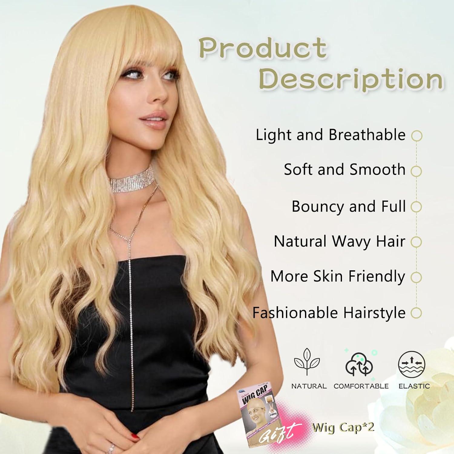 NAYOO Blonde Wigs with Bangs Long Wavy Wigs for Women 24 Inches Synthetic Heat Resistant Wig Natural Looking Realistic Wigs for Daily Party Use/Halloween Use(Blonde,24 Inch)