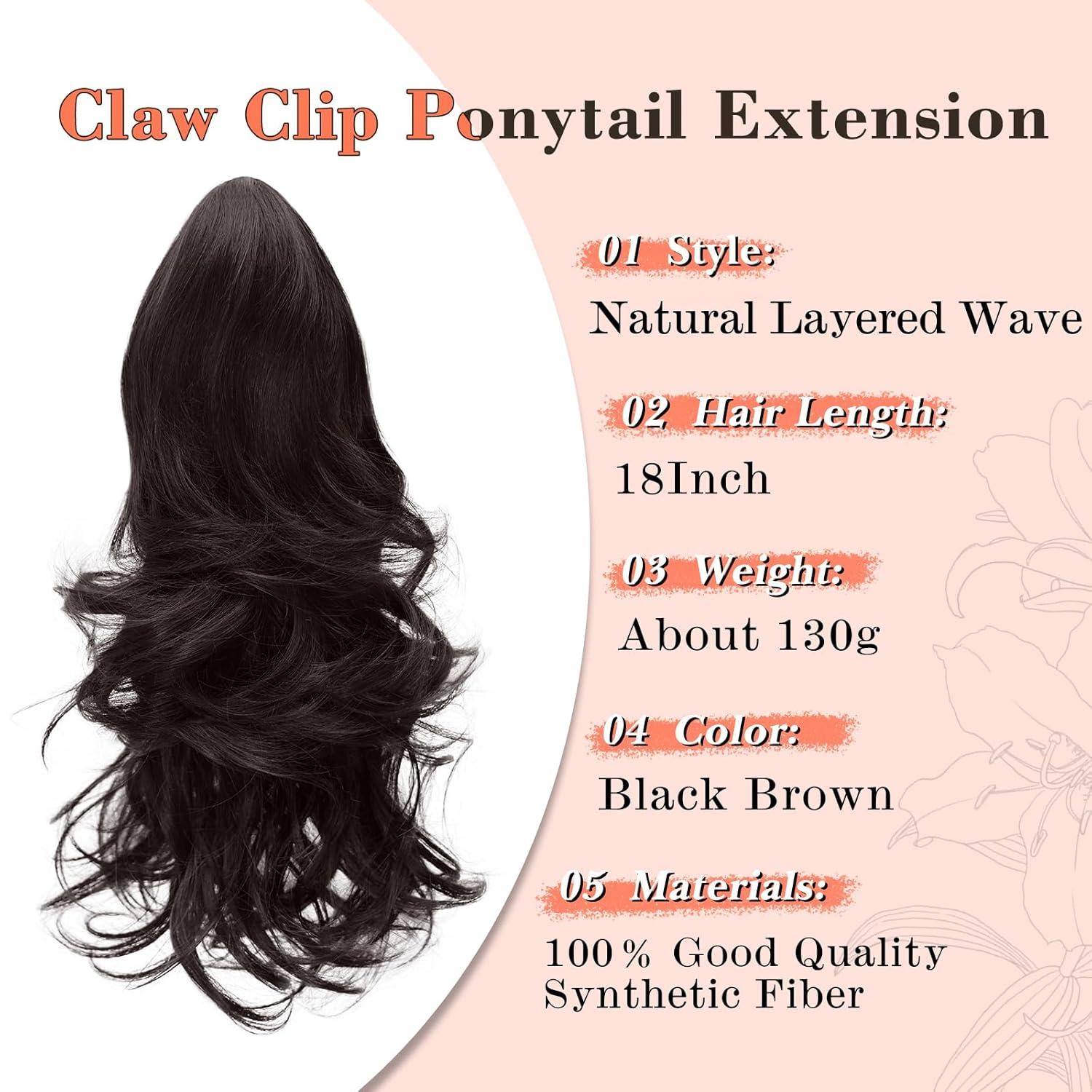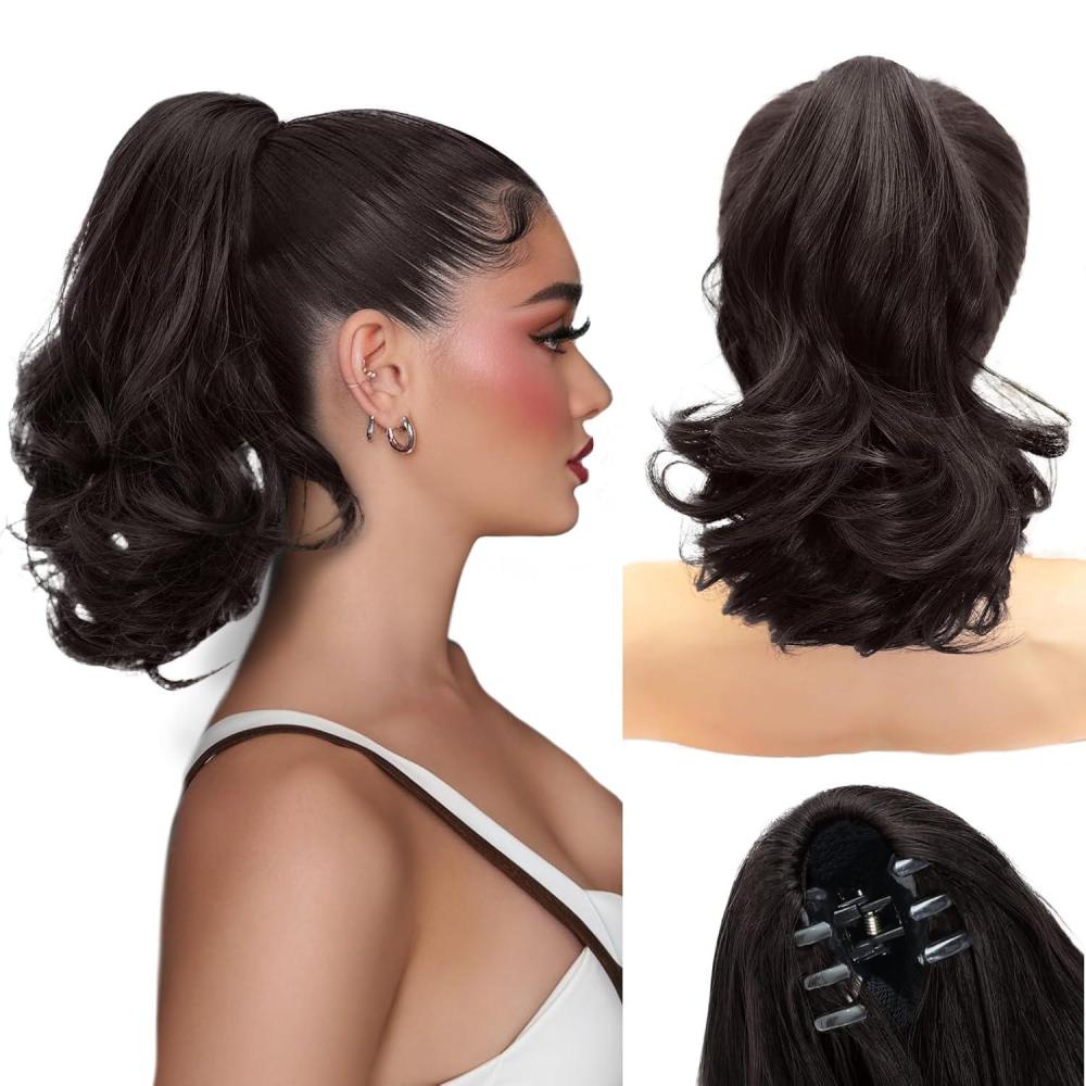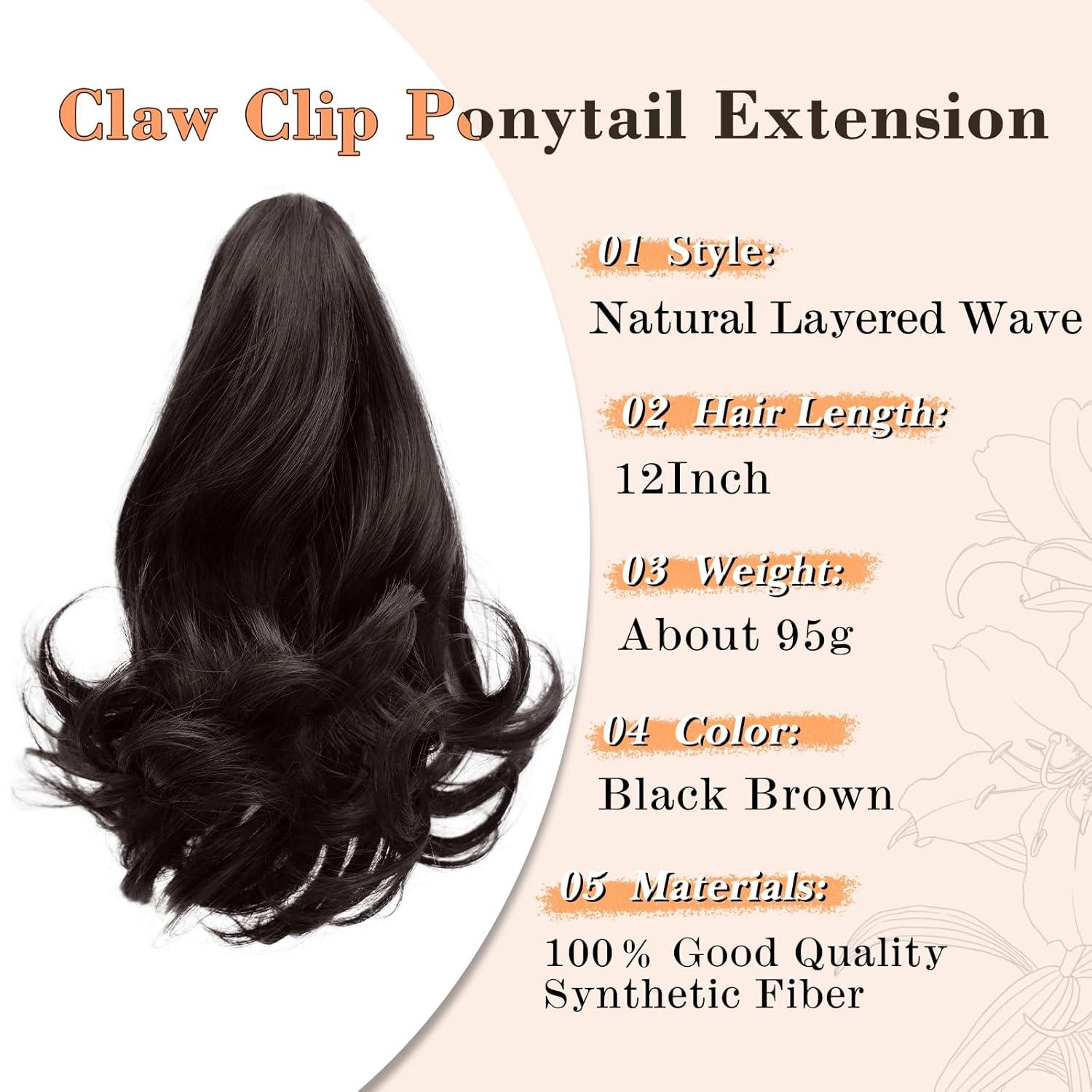 NAYOO Claw Clip Ponytail Extension Black 12″ Short Wavy Ponytail Clip in Hair Extensions for Women Curly Natural Layered Pony Tails for Short Thin Hair Synthetic Hairpiece(Black)(Black Brown)