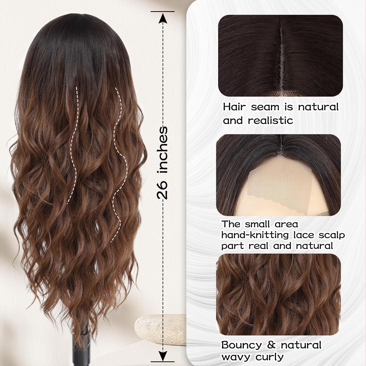 NAYOO Dirty Blonde Wave Wig with Bangs, Heat Resistant Long Wavy Synthetic Hair for Women, for Daily Use Party Halloween (Dirty Blonde,24Inch)(Ombre Brown)