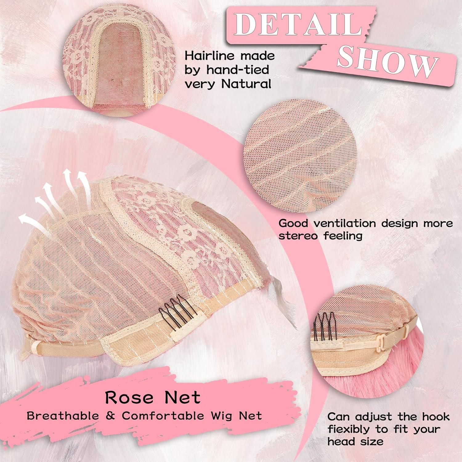 Strap And Rose-colored Breathable Net: Adjustable straps make this pink wig suitable for various head sizes and shapes, and it is equipped with an elastic and breathable rose net. You can wrap it in a fixed position to adjust different head sizes. Strong and durable , breathable, and comfortable, easy to adjust.