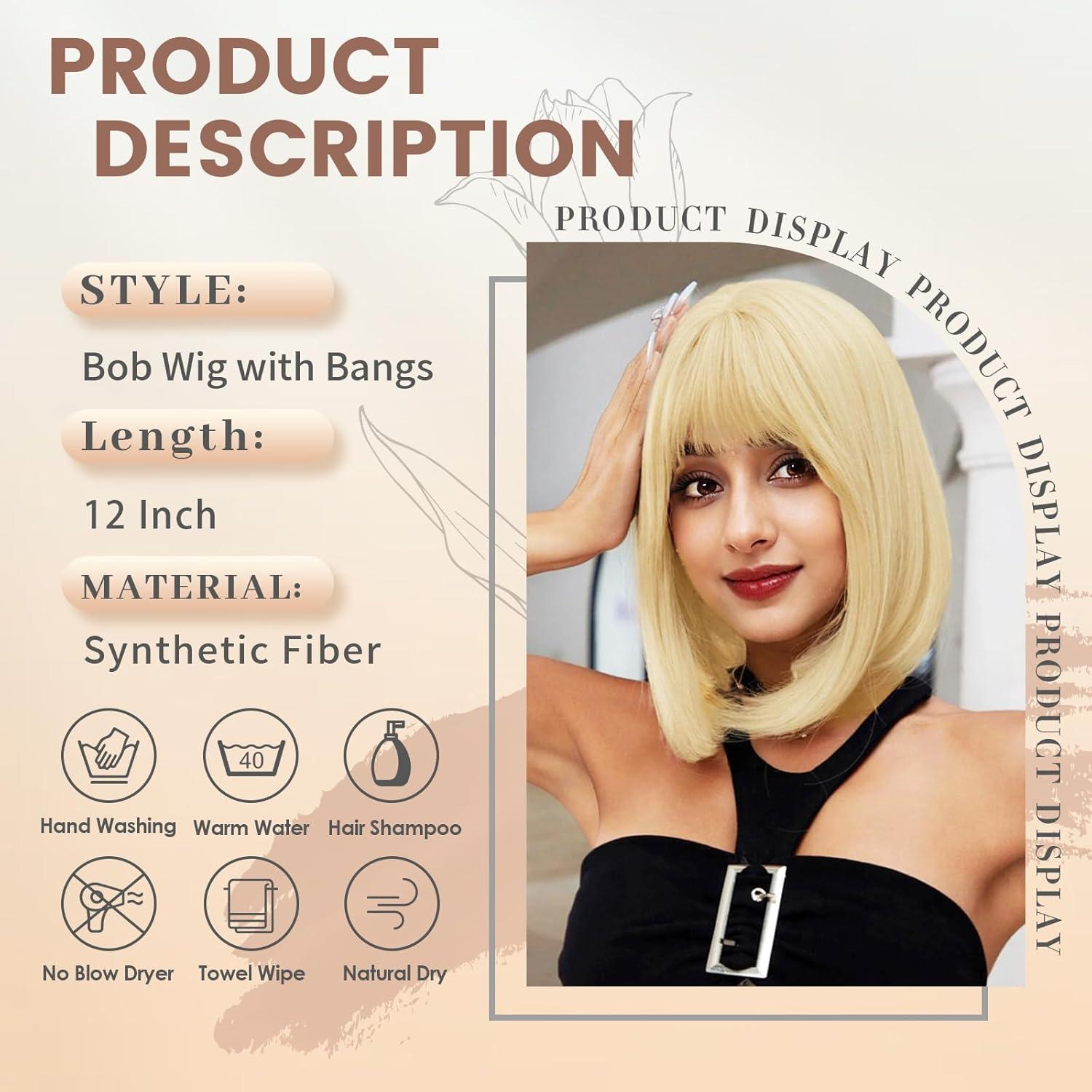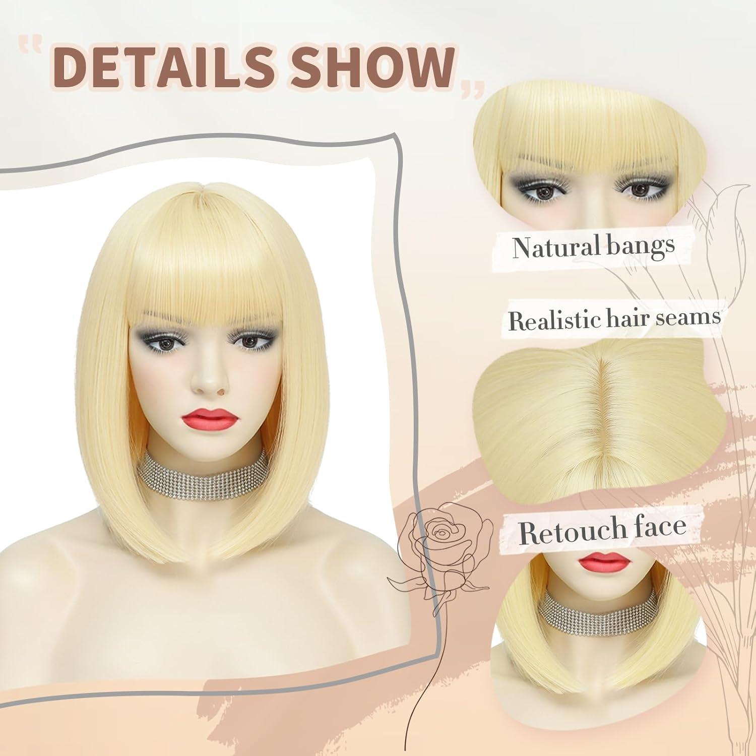 【Excellent Wig Quality】NAYOO Platinum blonde bob wigs with bangs is made of high-quality heat resistant fiber hair—double machine weft, tangle-free, shedding-free, silky and soft. The blonde wig looks just like your real hair for long-term use.