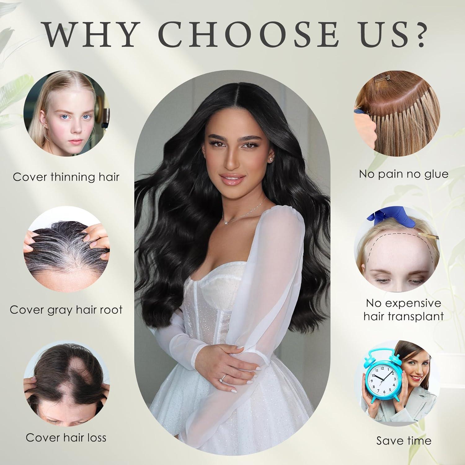 【Easy to Wear】The hair topper has 4 anti-slip clips. Clip-in installation is damage-free – no tape or glue needed, just clip into your own hair for instant volume. Get perfect look in seconds! Lightweight and comfortable wear all day with confidence.
